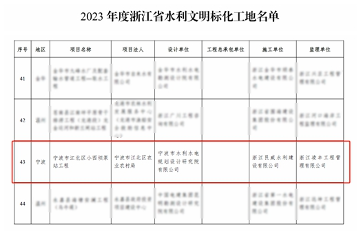近日,經(jīng)浙江省水利廳2023年度浙江省水利文明標(biāo)化工地名單公布,我院承擔(dān)全過程工程咨詢的寧波市江北區(qū)小西壩泵站工程喜獲“浙江省文明標(biāo)化工地”稱號(hào),成為寧波市水利行業(yè)的標(biāo)桿工程。